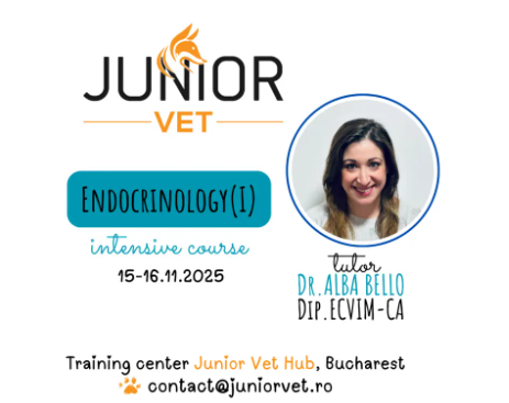 Curs – Endocrinologie Perioada desfasurare: 15-16 noiembrie 2025 Eveniment creditat cu puncte EMVC Cost: Organizator: Junior Vet Hub SRL Locatie: Bucuresti, Junior Vet Hub Adresa: Strada Grota Lacurilor 21, București